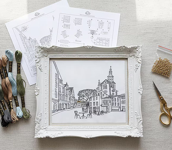 This Paris street scene hand embroidery kit is designed to provide both beginners and experienced embroiderers with the materials and guidance needed to create a beautiful and evocative piece of needlework that captures the charm and atmosphere of a Parisian street.